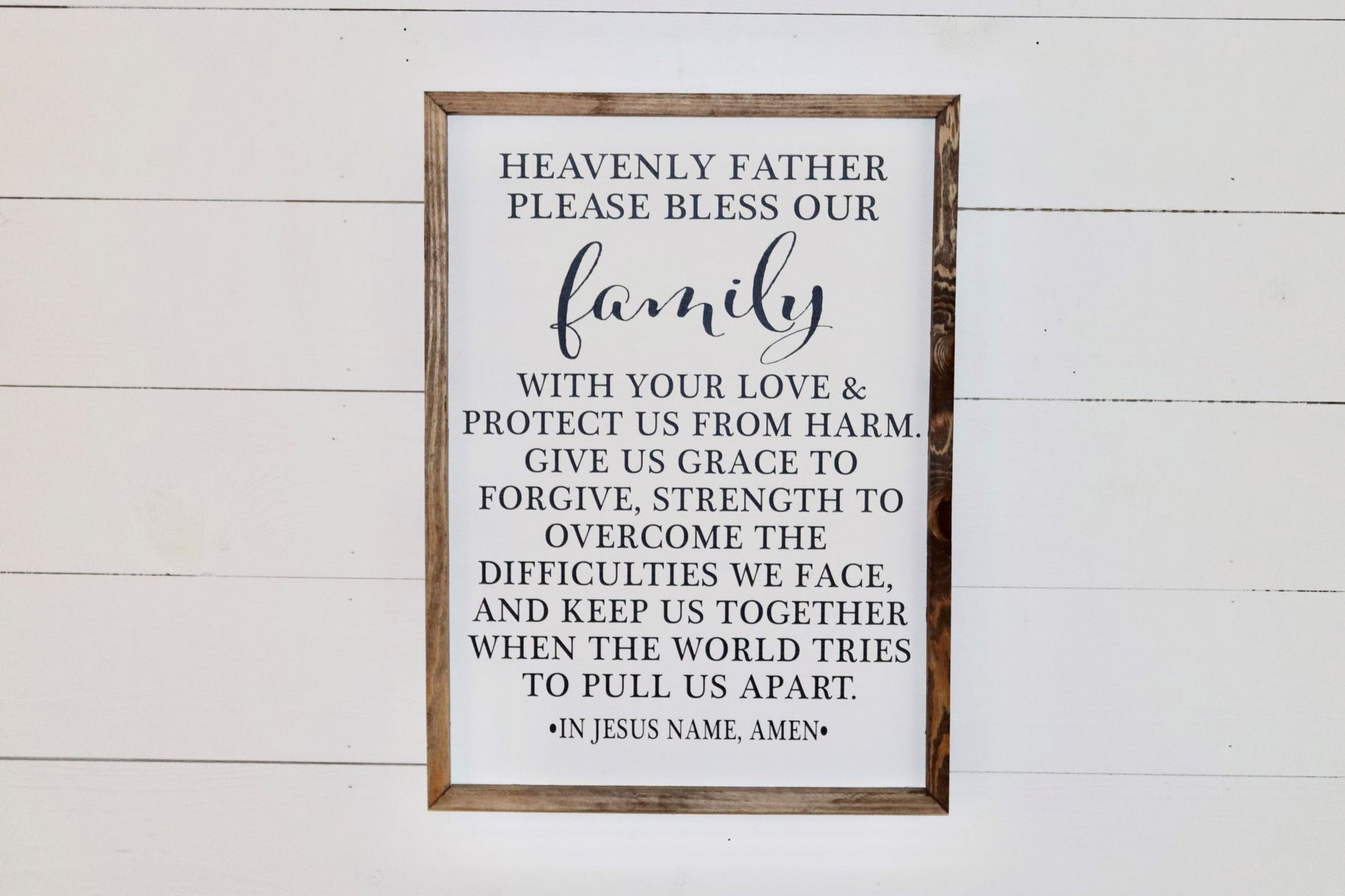 - "Heavenly father please bless our family with your love and protect us from harm. Give us grace to forgive, strength to overcome the difficulties we face, and keep us together when the world tries to pull us apart. In Jesus name, amen."