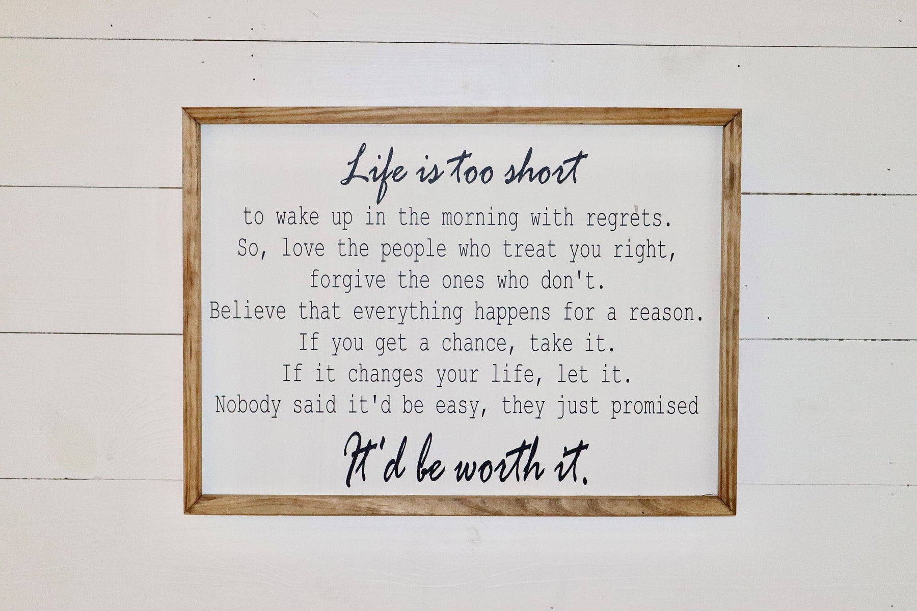 - "Life is too short to wake up in the morning with regrets. So, love the people who treat you right, forgive the ones that don't. Believe that everything happens for a reason. If you get a chance, take it. If it changes your life, let it. Nobody said it'd be easy, they just promised it'd be worth it."