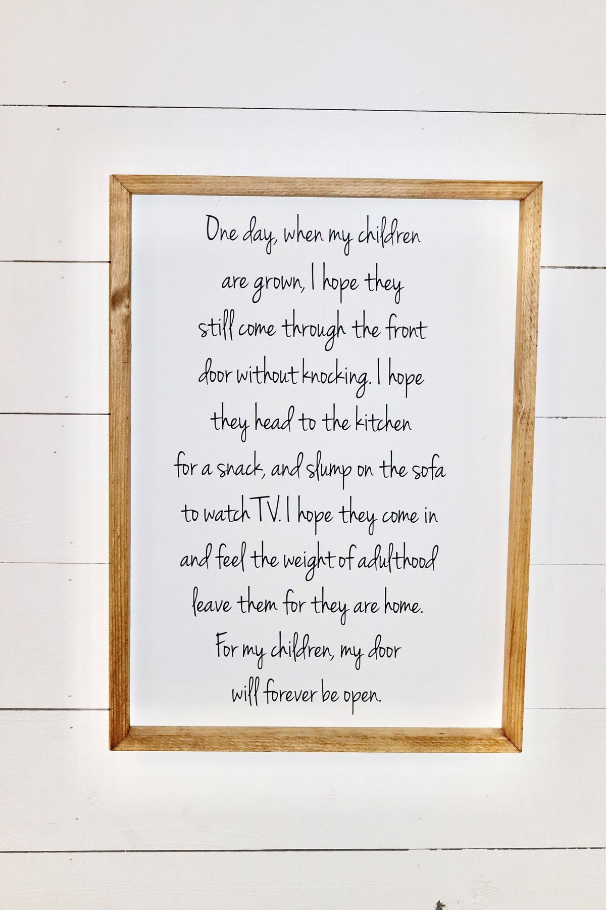 - "One day when my children are grown, I hope they still come through the front door without knocking. I hope they head to the kitchen for a snack and slump on the sofa to watch TV. I hope they come in and feel the weight of adulthood leave them for they are home. For my children, my door will forever be open"
